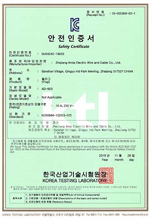 产品通过了中国CCC、德国VDE、英国BSI、澳大利亚SAA、巴西Brazil、阿根廷IRAM、韩国KC、日本PSE、GCC海湾七国、新加坡等安规认证,严格按ISO9001:2015 国际质量管理体系生产,符合欧盟ROHS,REACH环保标准。